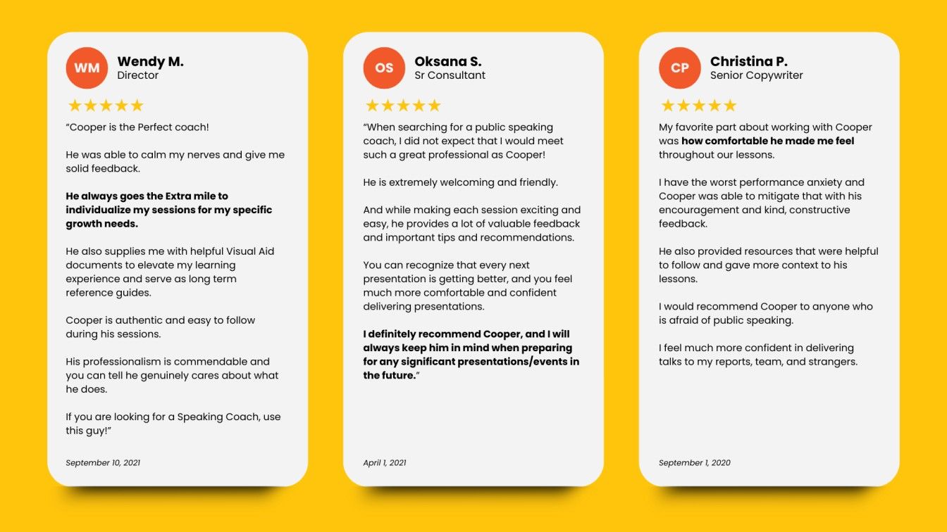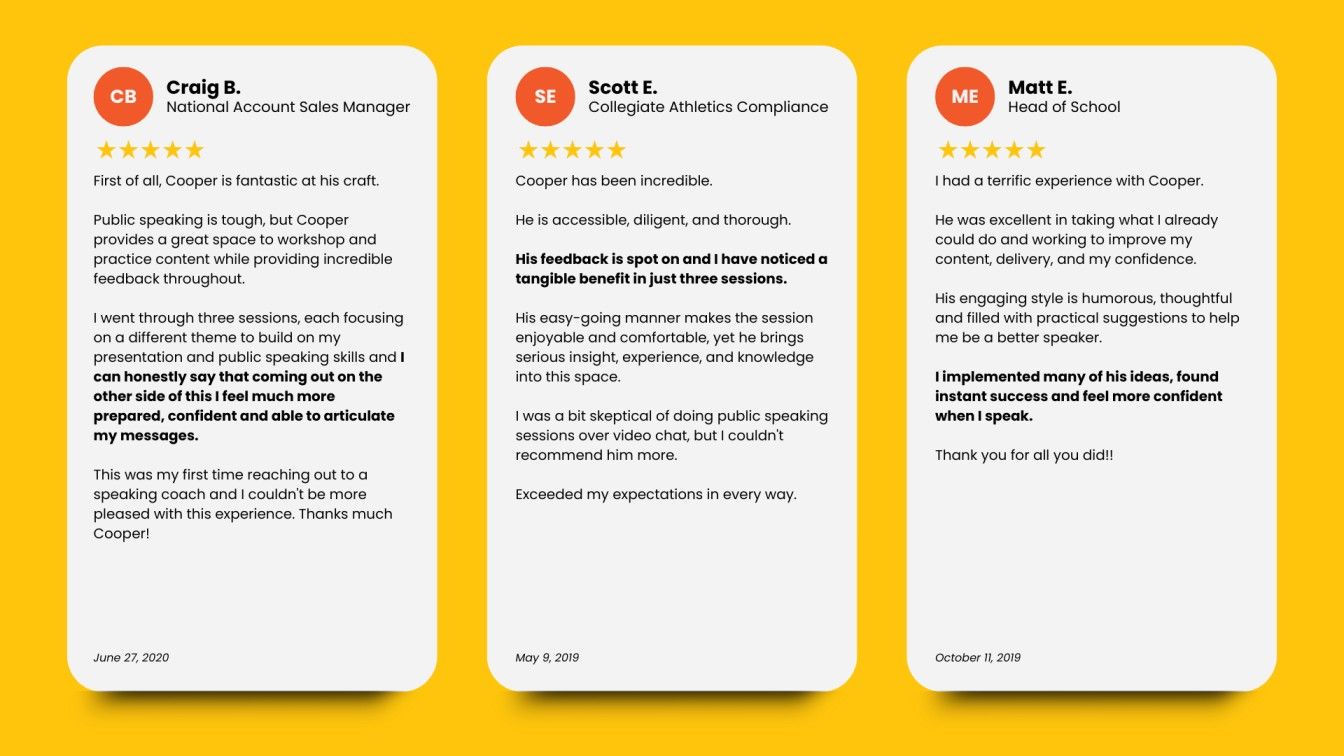 Our Core Package is 4 x 55-minute 1-on-1 sessions focused on presenting, impromptu speaking & executive presence.  You learn your strengths and fix key issues.