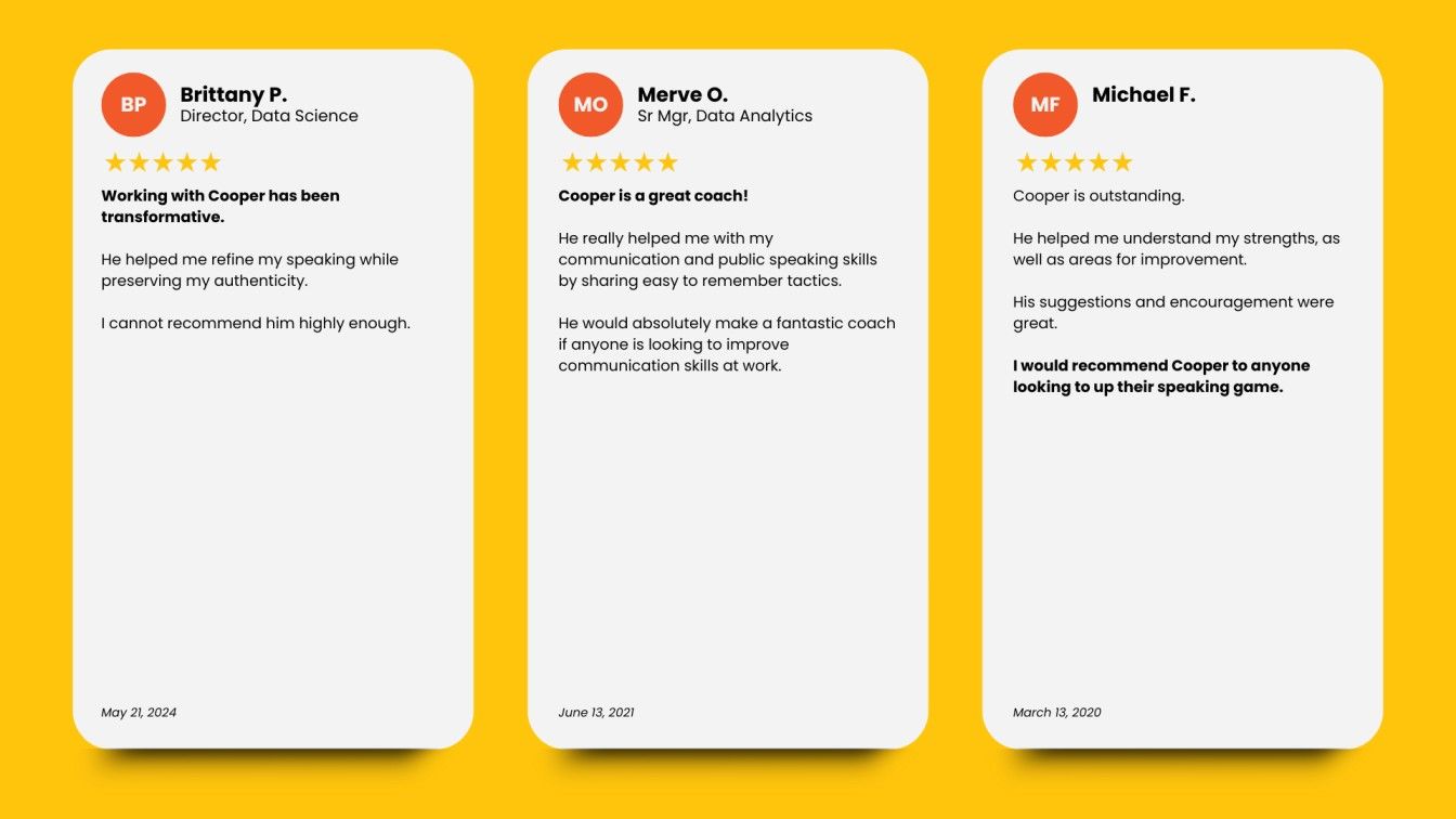 For the last 7 years, I’ve coached 300+ professionals 1:1 and trained 500+ more in live workshops — all focused on helping smart, capable people communicate clearly and confidently in the moments that matter at work.